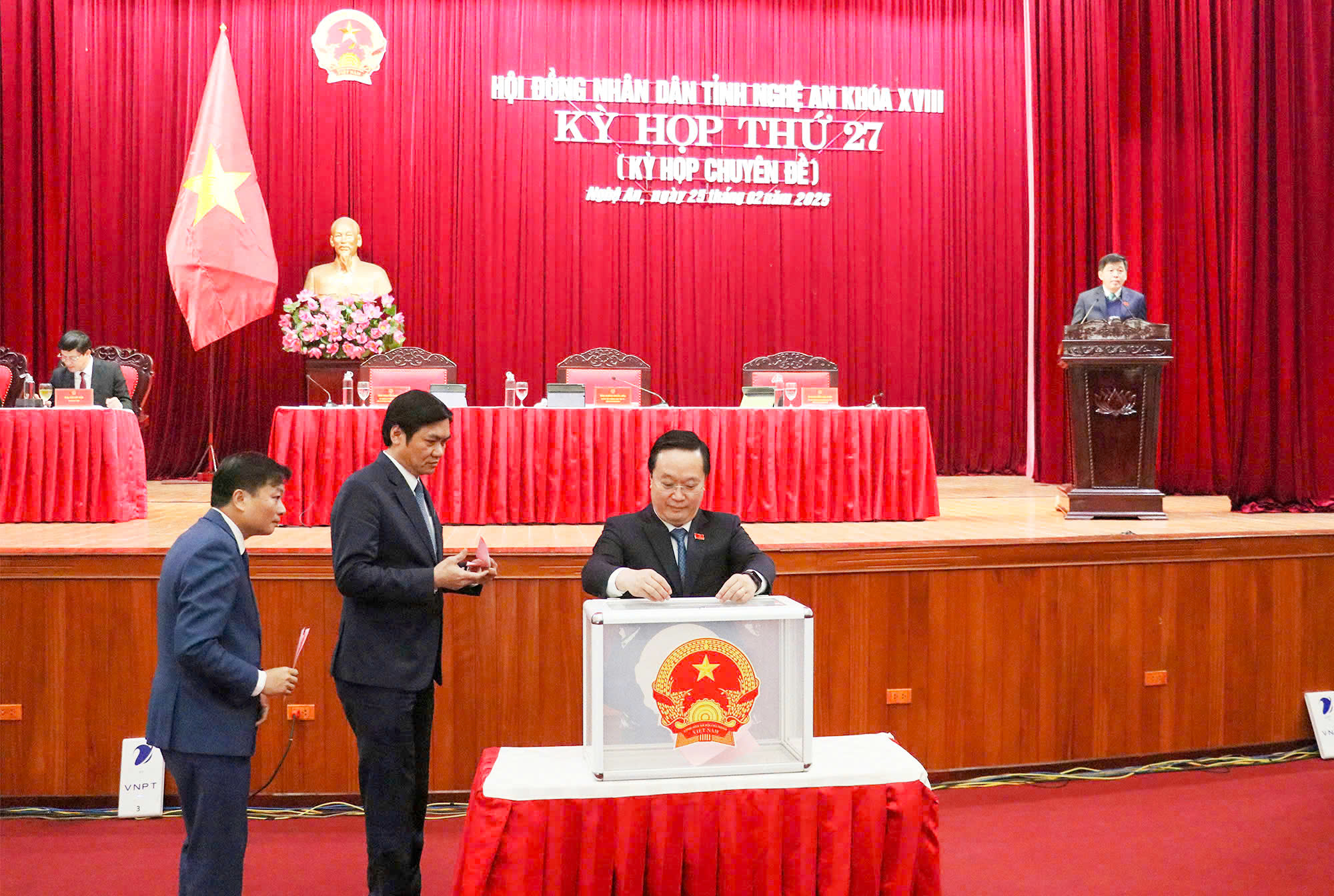 Các đại biểu bỏ phiếu bầu bổ sung Phó Chủ tịch UBND tỉnh Nghệ An nhiệm kỳ 2021 - 2026.