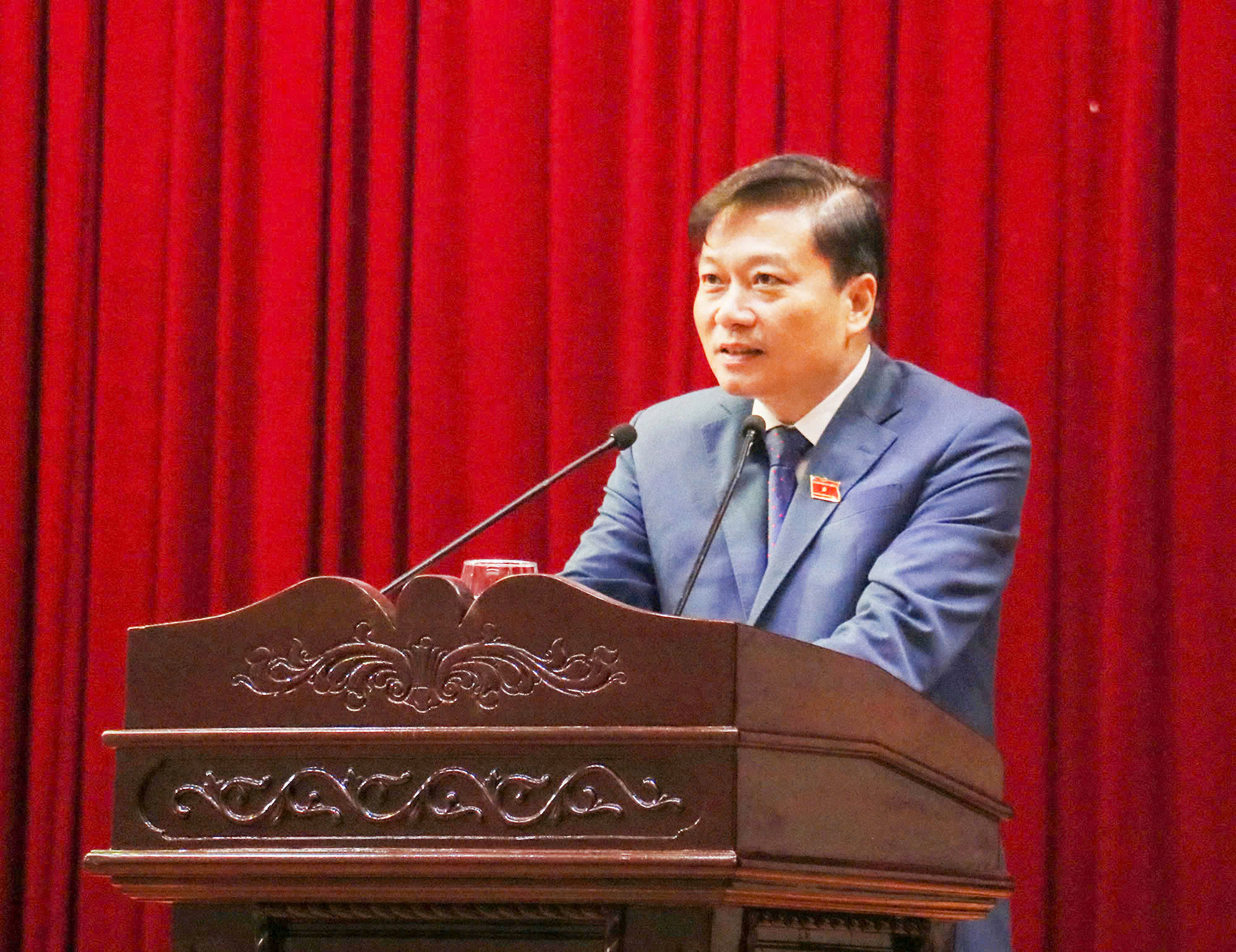 Chủ tịch UBND tỉnh Lê Hồng Vinh trình bày Tờ trình giới thiệu nhân sự bầu bổ sung chức vụ Phó Chủ tịch UBND tỉn Nghệ An nhiệm kỳ 2021 - 2026.