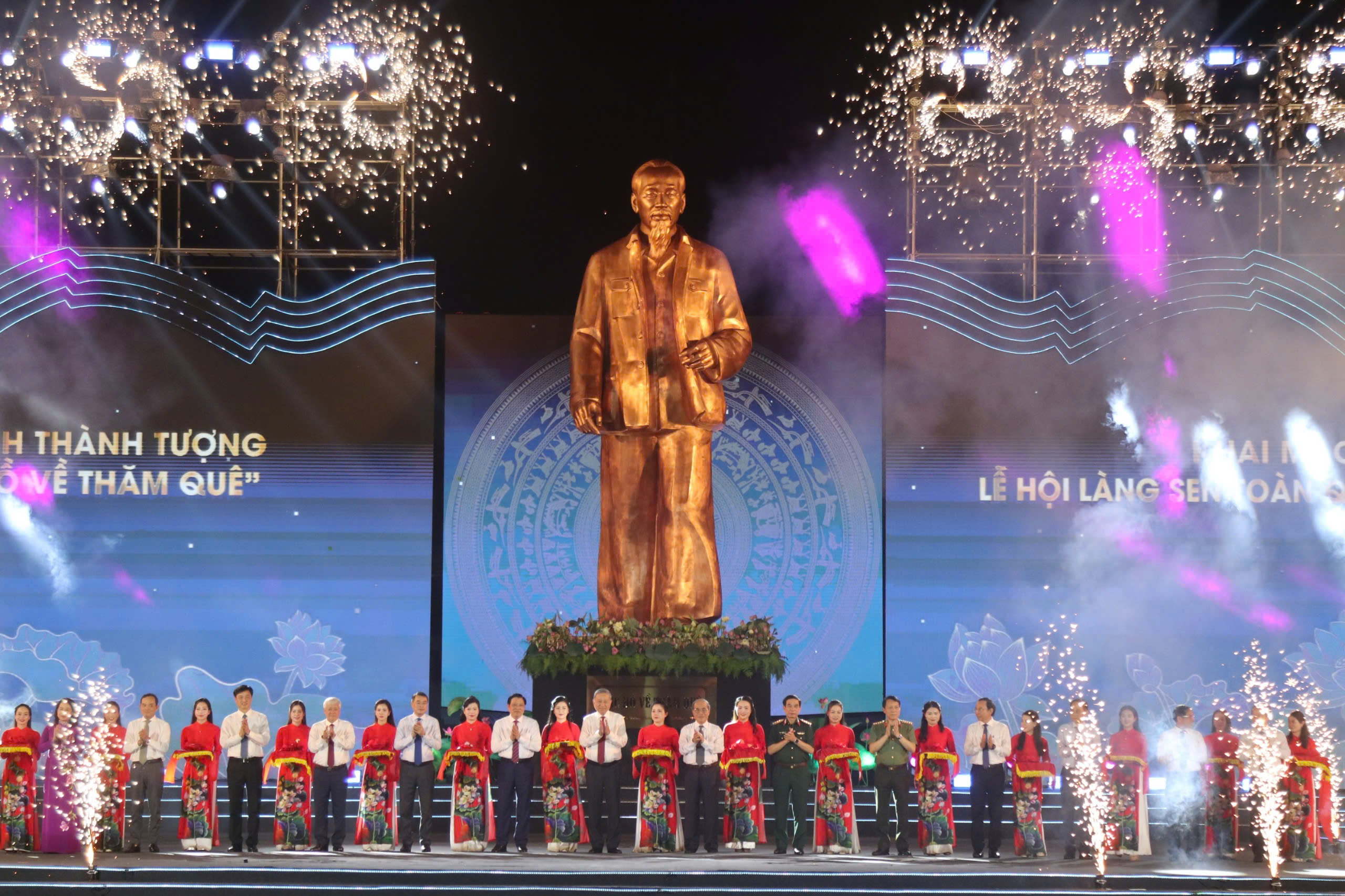 Tại đêm khai mạc Lễ hội làng Sen, Tổng Bí thư Tô Lâm đã cùng các đồng chí lãnh đạo Đảng, Nhà nước, lãnh đạo Bộ Công an, lãnh đạo tỉnh Nghệ An và các đại biểu đã thực hiện nghi thức cắt băng khánh thành Tượng đài “Bác Hồ về thăm quê”.