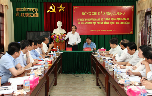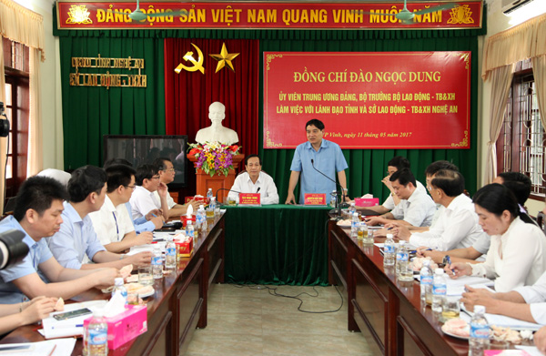 Kết luận buổi làm việc, Bộ trưởng Đào Ngọc Dung bày tỏ vui mừng tỉnh Nghệ An trong những năm qua cùng với sự phát triển nhanh về kinh tế, đã quan tâm chú trọng đảm bảo an sinh xã hội, cải thiện sinh kế cho người dân. Các lĩnh vực giảm nghèo, dạy nghề, xuất khẩu lao động, phòng chống tệ nạn xã hội… đều có những chuyển biến khả quan. “Nghệ An là nơi đóng góp nhiều cho Trung ương, nhiều sáng kiến, cách làm sáng tạo đều bắt nguồn từ địa phương. Trong năm 2017 và các năm tiếp theo, tỉnh cần chú trọng quan tâm, gắn kết hai chương trình xây dựng nông thôn mới và giảm nghèo bền vững. Giải quyết hai chương trình này là giải quyết được rất nhiều vấn đề về an sinh xã hội. …” - Bộ trưởng Đào Ngọc Dung nhấn mạnh.