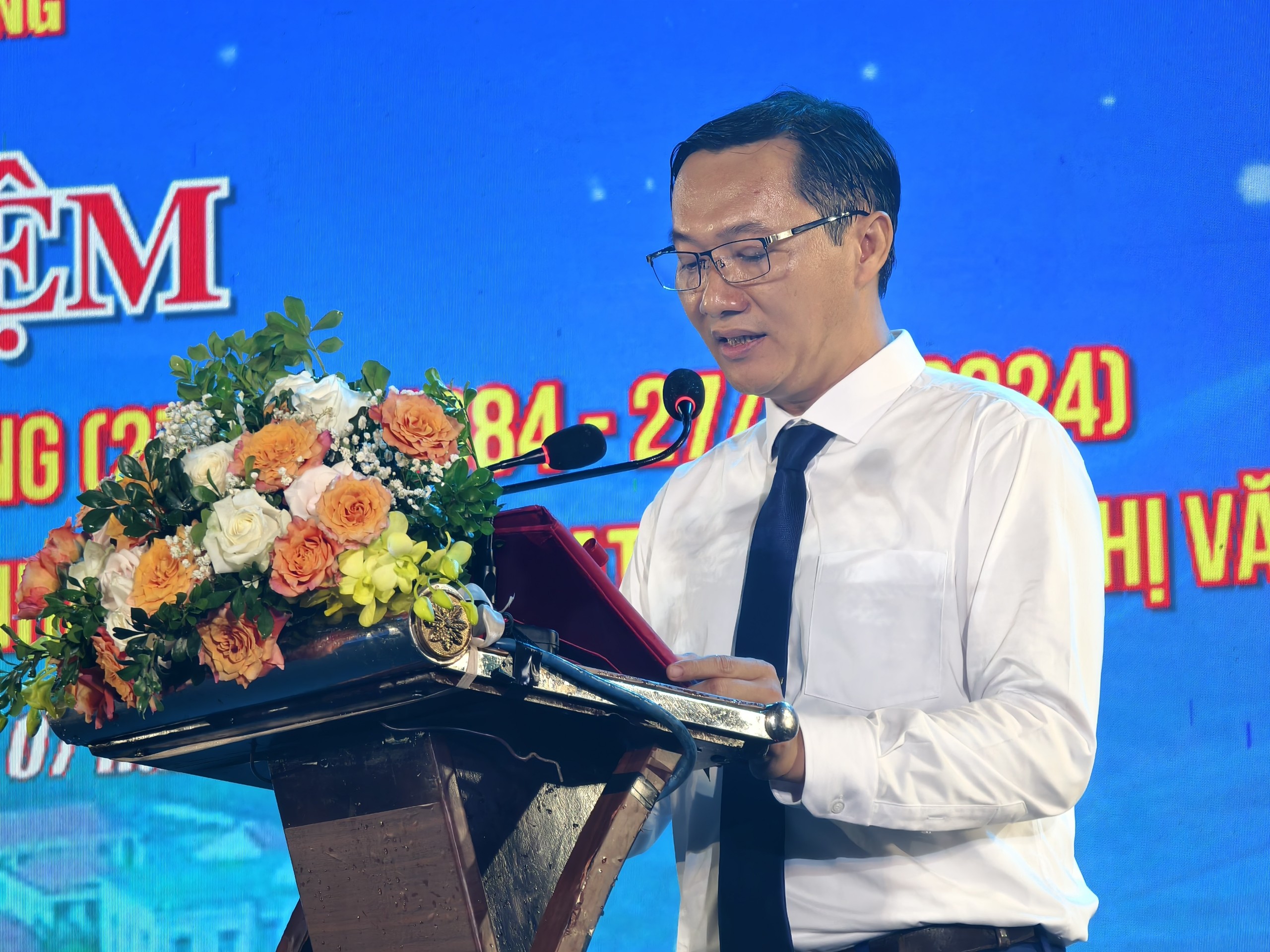 Ông Tưởng Đăng Hào - Phó Bí thư Đảng uỷ, Chủ tịch UBND thị trấn Thanh Chương đọc diễn văn tại buổi lễ.