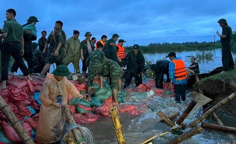 Lực lượng chức năng của tỉnh Nghệ An trắng đêm 29-9 khắc phục sự cố đê tại huyện Hưng Nguyên.