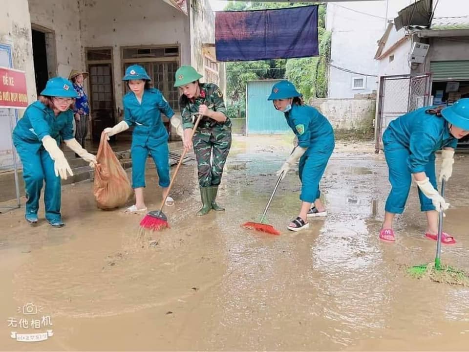 Các nữ dân quân tự vệ xã Thanh Mỹ, Thanh Chương, Nghệ An đang dọn dẹp, khắc phục hậu quả sau mưa lũ gây ra.