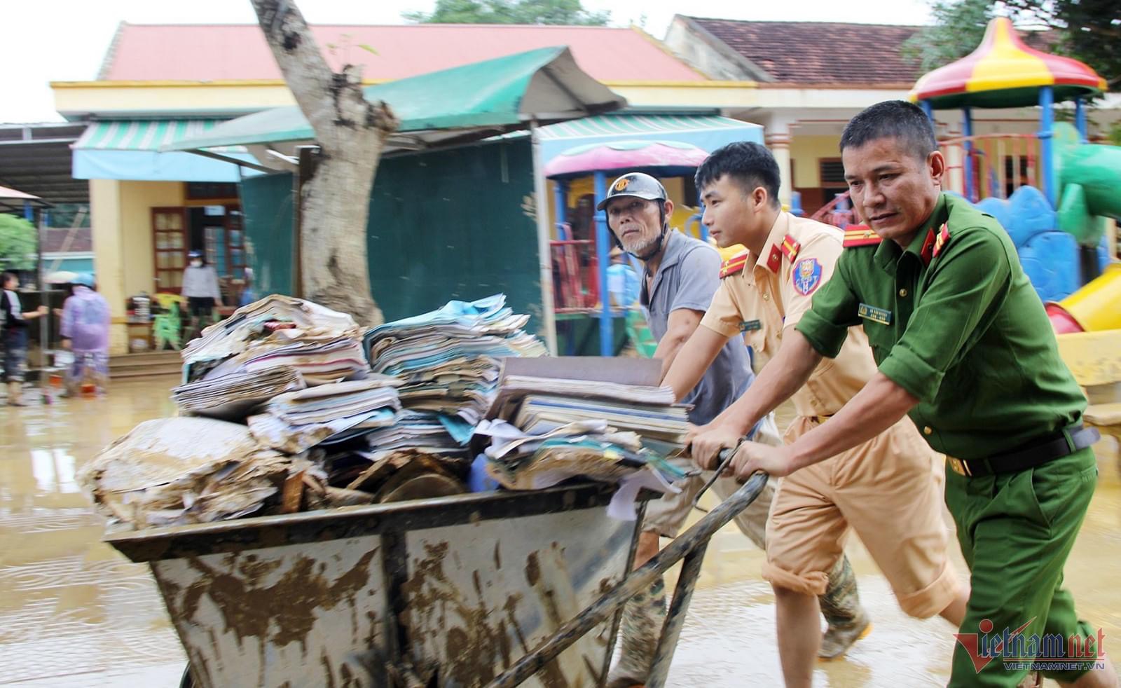 Sách vở và đồ dùng của học sinh tại nhiều điểm trường bị nước lũ nhấn chìm, trộn lẫn trong bùn