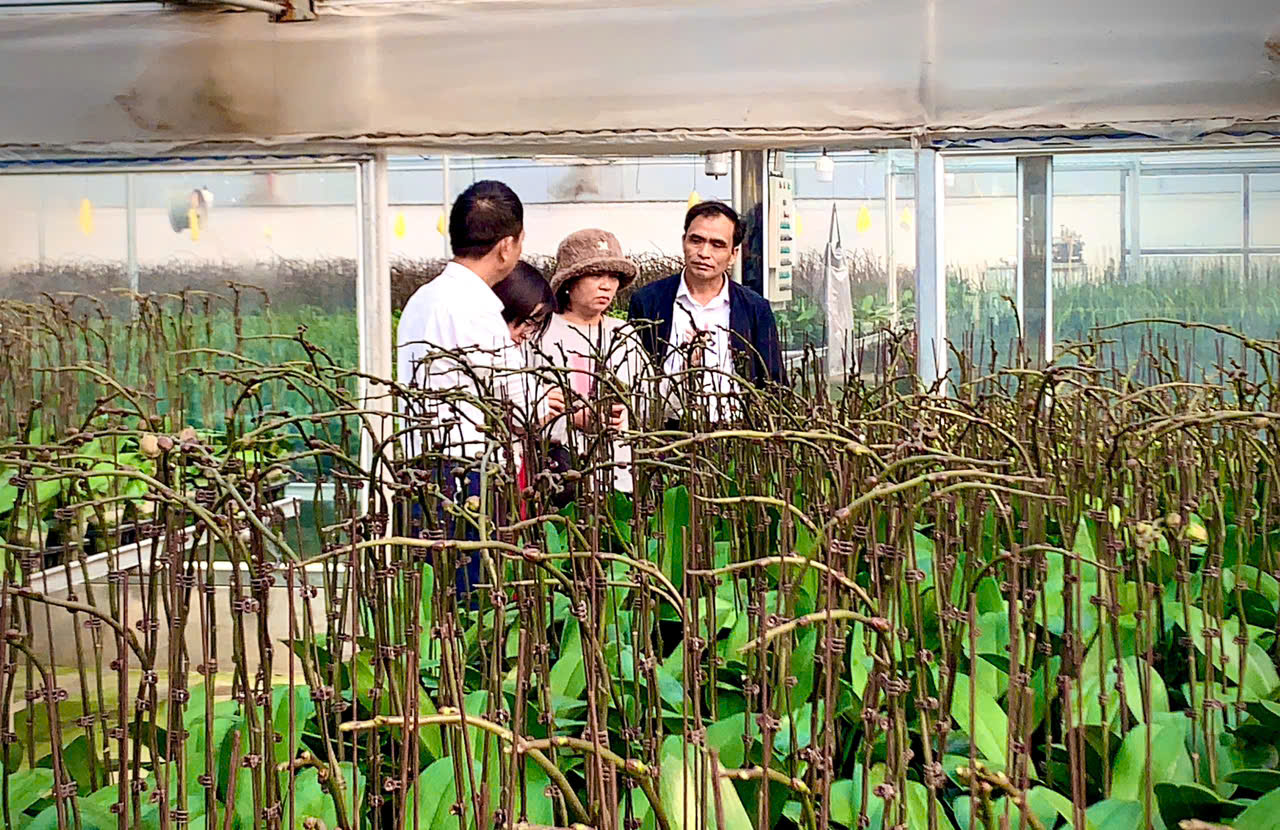 Bà Phạm Thị Hoa, Giám đốc HTX Sản xuất và Kinh doanh Hoa cây cảnh Nam Phong (người đội mũ đứng giữa) giới thiệu và hướng dẫn khách hàng kỹ thuật chăm sóc hoa lan hồ điệp tại khu nhà trồng lan có diện tích 2.000 m2 - Ảnh: Hồ Thanh