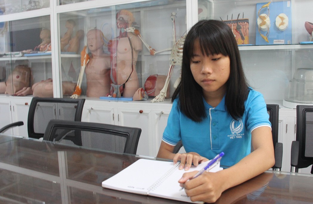 “Ban đầu, em tập cầm bút bằng tay trái cho chắc chắn rồi tập viết theo từng nét. Phải mất một thời gian rất dài thì em mới có thể viết và làm những công việc khác bằng tay trái.