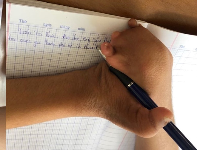 | Dù chỉ với 2 ngón tay nhưng chữ viết của Thức vẫn gọn gàng, sắc nét. Hà Ánh |