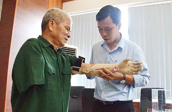 | Cánh tay robot do sinh viên trường Đại học Phạm Văn Đồng chế tạo trao tặng cho thương binh Phan Văn Hào. |