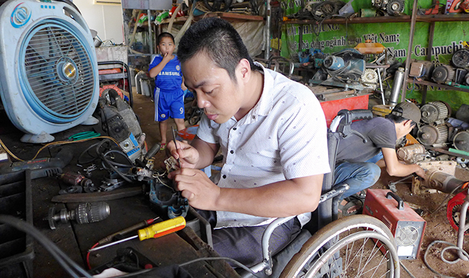 Vượt qua những mặc cảm của bản thân, anh Trung mạnh dạn đến TP Hồ Chí Minh theo học nghề sửa chữa điện cơ tại lớp học nghề dành cho người khuyết tật và trẻ mồ côi.
