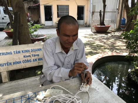 | Hai tay anh Minh thoăn thoắt tháo ốc vít, tước vỏ nhựa dây điện trước khi lắp hoàn chỉnh bộ ổ cắm. |