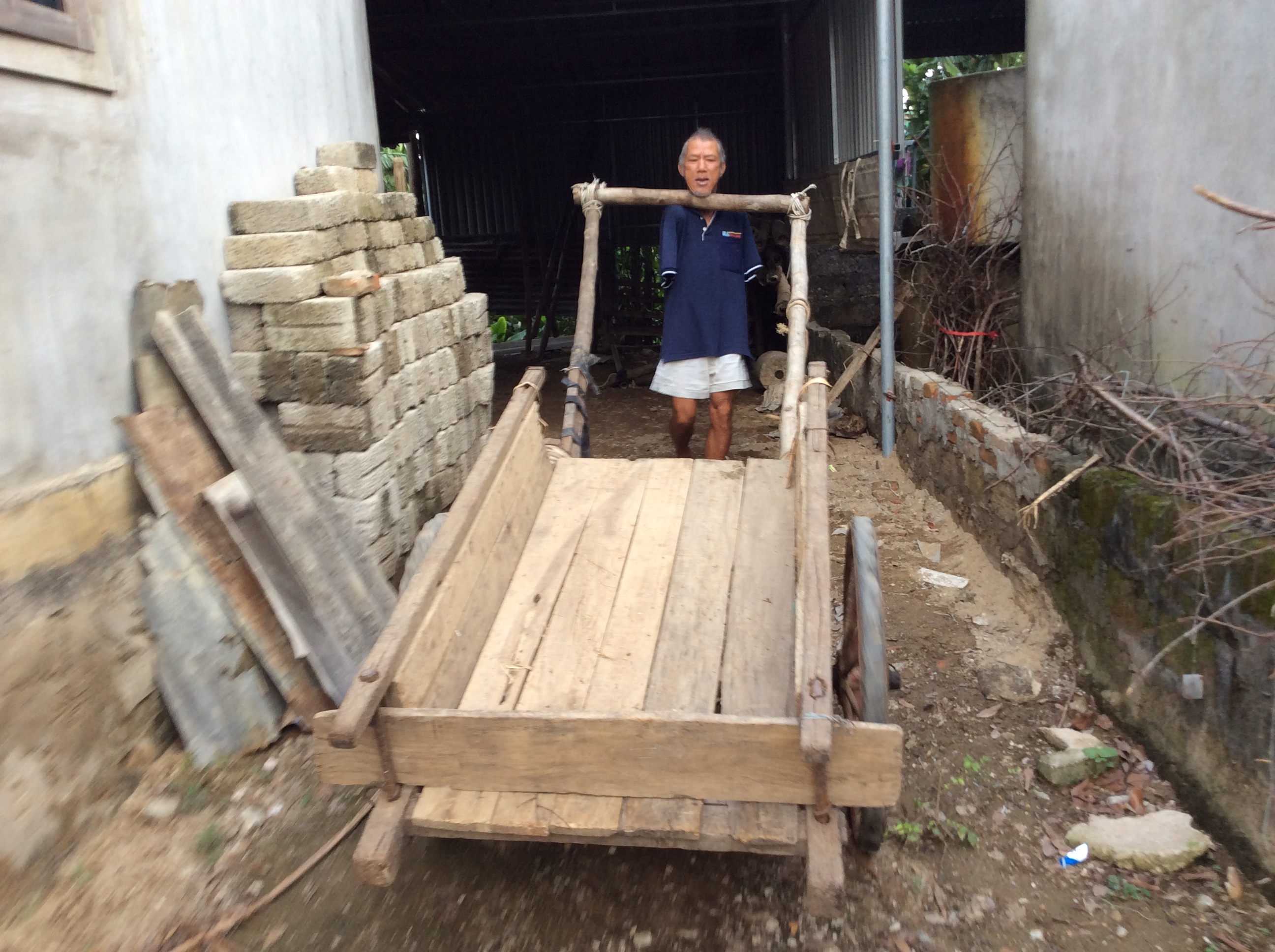 | Hình ảnh bắt đầu tiên khi gặp ông là lúc ông đang tự mình kéo chiếc xe bào vào nhà bằng cổ của mình |