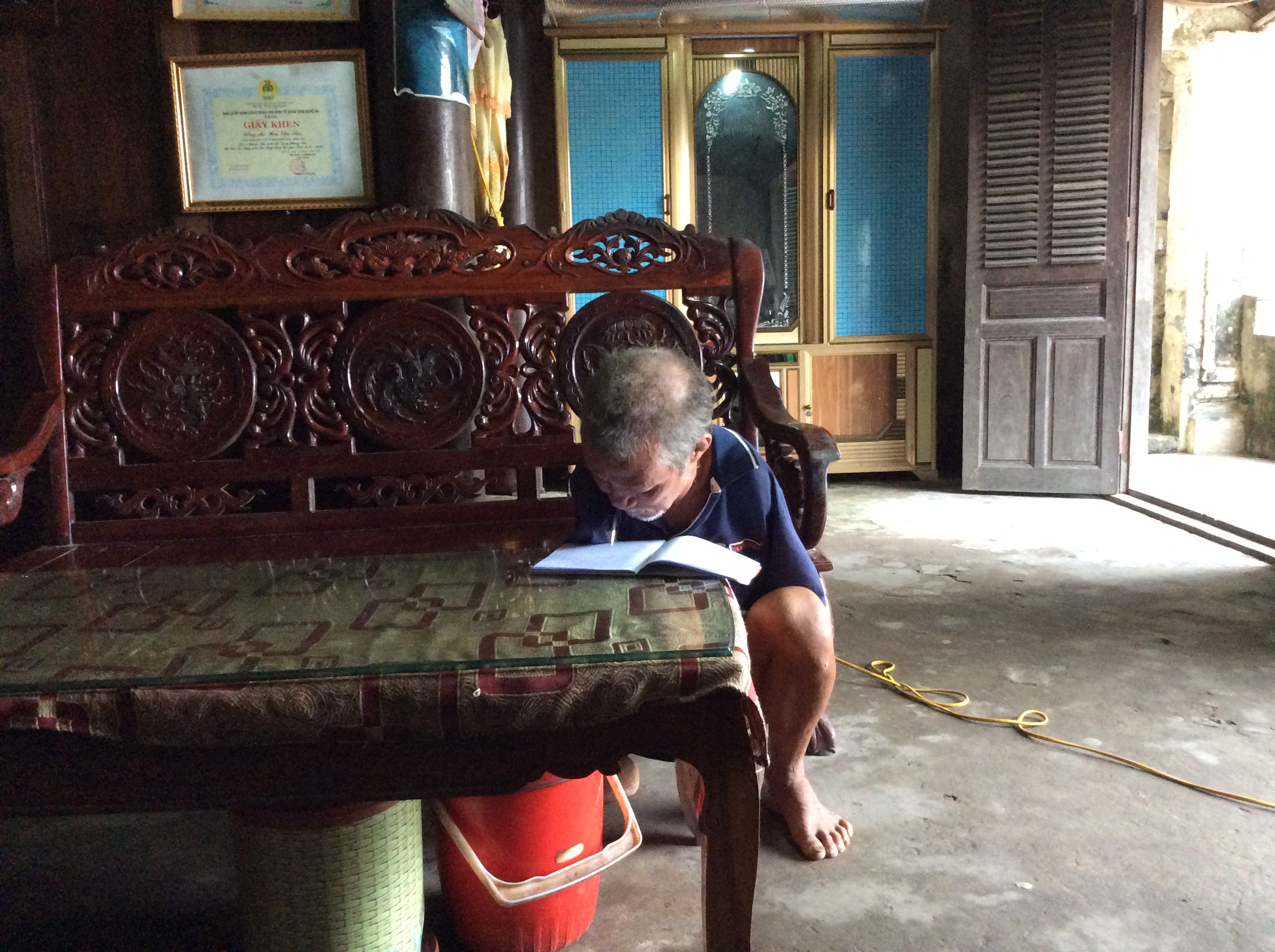 Chúng tôi tìm đến nhà ông vào buổi chiều muộn, trời “nhập nhoạng” tối, tình cờ gặp ông trên đường đi làm về tới nhà, thấy ông với thân hình gầy gò, da xạm đen, tóc bạc trắng, đang dùng cổ của mình kéo chiếc xe bò vào nhà với đôi tay áo lòng thòng và những động tác nặng nhọc, thấy vậy chúng tôi không khỏi xúc động trước cuộc sống hàng ngày của ông trên đôi tay không còn nguyên vẹn.