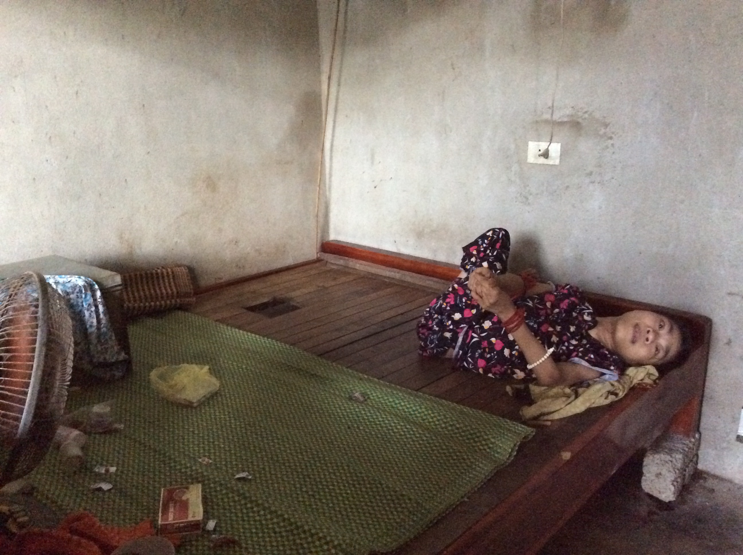 | Chị Sen nằm liệt trên giường ở góc nhà trong tình trạng tay chân đang bị buộc khỏi bị giật xuống khi lên cơn |