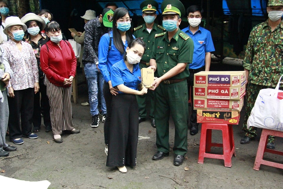 Trần Trà My tặng quà trong chuyến hoạt động tình nguyện tại biên giới biên phòng nơi giáp danh với Campuchia. Ảnh: NVCC