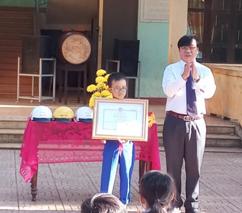 | Thừa uỷ quyền của Bộ trưởng Bộ GD&ĐT Phùng Xuân Nhạ, đại diện ngành GD&ĐT tỉnh Quảng Trị trao bằng khen cho học sinh Hoàng Đức Sơn - tấm gương vượt khó vươn lên trong học tập. |