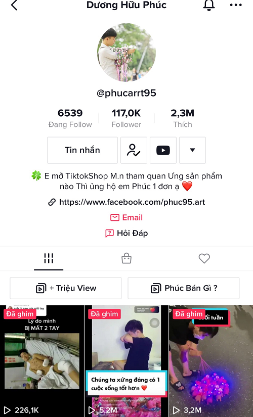 Kênh tiktok của Phúc hiện có hơn 100k lượt theo dõi, hơn 2,3 triệu lượt thích