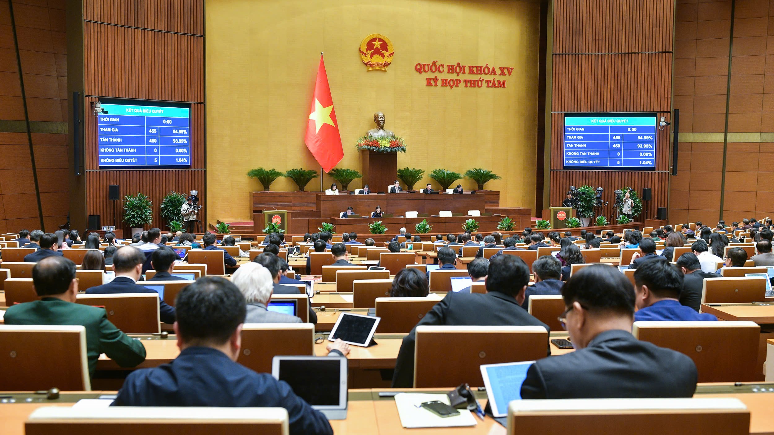 Kết quả biểu quyết điện tử cho thấy, có 450/455 đại biểu Quốc hội tham gia biểu quyết tán thành, chiếm 93,95% tổng số đại biểu Quốc hội. Như vậy, Quốc hội đã chính thức thông qua Nghị quyết về thí điểm xử lý vật chứng, tài sản trong quá trình điều tra, truy tố, xét xử một số vụ việc, vụ án hình sự với tỷ lệ tán thành cao.
