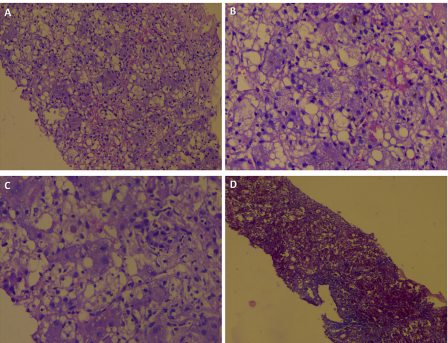 Sinh thiết gan cho thấy (A) kiến trúc gan bị biến dạng với nhiễm mỡ nặng với thoái hóa bóng, hỗn hợp lymphocytic và bạch cầu trung tính; (B) giao diện viên gan cùng với ứ mật nội sọ; (C) viêm đường mật (haematoxylin và eosin stain, 20) và (D) hoại tử cầu nối màng ngoài tim (Masson trichrom stain, 20)
