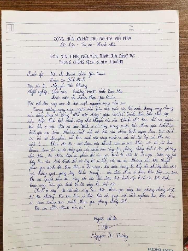 Đơn tình nguyện tham gia lực lượng phòng, chống dịch Covid-19 của cô giáo trẻ Nguyễn Thị Thương, xã Bình Định, huyện Yên Lạc (Ảnh Quang Nam).