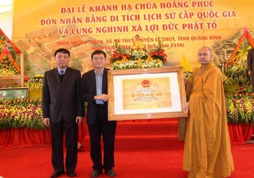 Đại diện Bộ VH-TT&DL trao Bằng xếp hạng Di tích Quốc gia chùa Hoằng Phúc cho tỉnh Quảng Bình. (Ảnh: Internet)