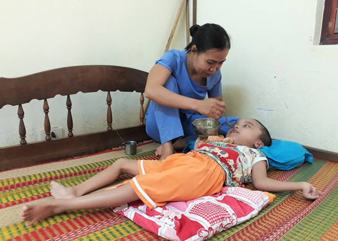 Chị Huệ cho biết, em bé tên là Nguyễn Văn Sơn, bị bệnh não úng thủy. Vì hoàn cảnh, em được gia đình đưa đến làng từ khi mới lọt lòng, đến nay đã gần 14 năm. Căn bệnh khiến em Sơn chỉ nằm một chỗ và chỉ ăn cháo, cơm xay nhuyễn.