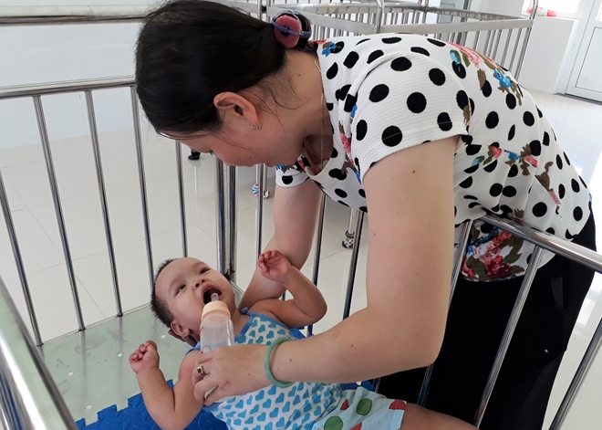 Thức ăn xay hơi cợn một chút em cũng bị sặc, nôn ói hết ra, vì vậy việc cho em ăn luôn phải cẩn trọng… Dẫn chúng tôi dạo vòng qua khu trẻ sơ sinh đang được nuôi dưỡng, các “mẹ nuôi” Nguyễn Thị Bông (38 tuổi), Dương Thị Ngọc (37 tuổi) cho hay, ở đây ngoài em Sơn còn có 8 đứa trẻ khác là những trẻ sơ sinh bị bỏ rơi từ lúc lọt lòng mẹ.