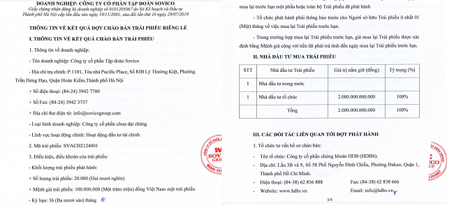 Theo đó, Sovico Group đã “hút” vốn thành công 1.000 tỷ đồng trái phiếu với kỳ hạn 36 tháng vào ngày 30/11 cho một nhà đầu tư tổ chức. Đây là loại trái phiếu không chuyển đổi, không có tài sản đảm bảo. Lãi suất cố định 10,5%/năm được trả định kỳ 6 tháng/lần.