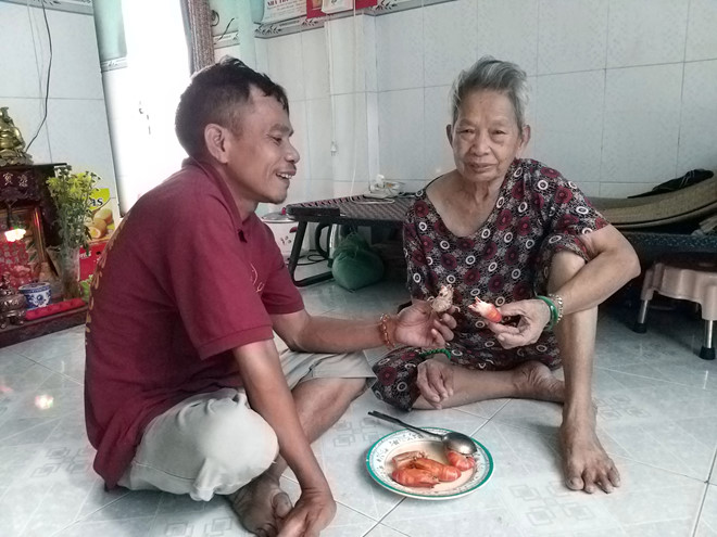 Tò mò, chúng tôi tìm đến căn nhà người bán vé số khuyết tật nói trên đang sống trong hẻm 648 đường Cách Mạng Tháng Tám, P.11, Q.3. Bà Nguyễn Thị Ngữ, 84 tuổi, mẹ của anh Ti bưng ra mấy con tôm to, giọng nghèn nghẹn: “Thằng Ti mua về cho tui ăn nè. Tui ăn hai con, định chừa cho nó hai con. Vậy mà nó “ép” tui ăn, không thì nó giận, nó quạu. Thỉnh thoảng nó còn mua cua nữa, mua toàn đồ ngon không à. Nó nói con mua gì về má ráng ăn hết cho có sức khỏe”.