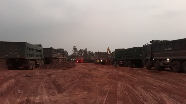 | Hàng chục xe tải hạng nặng chờ lấy đất |