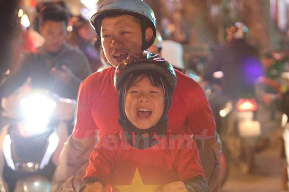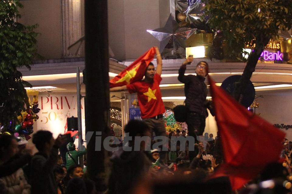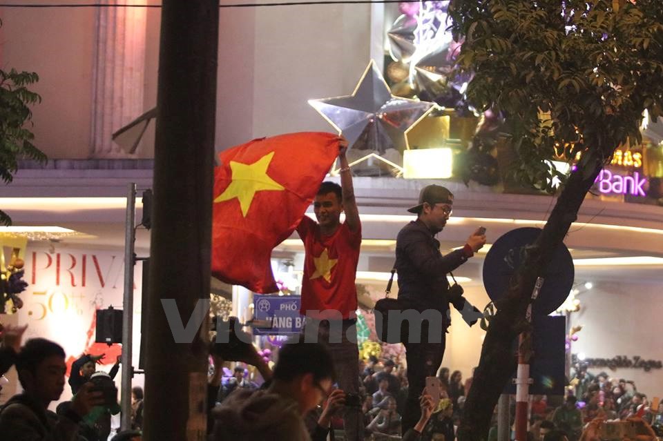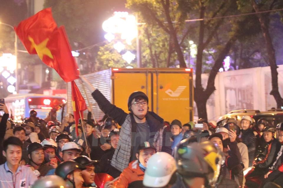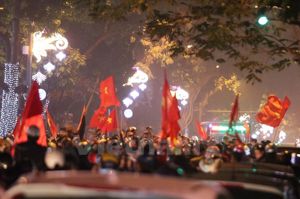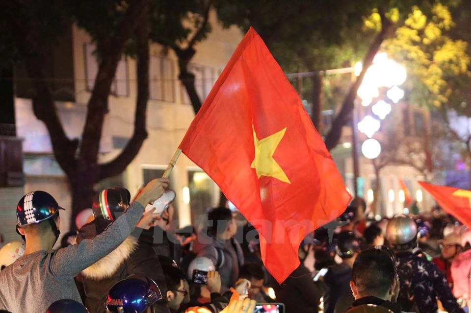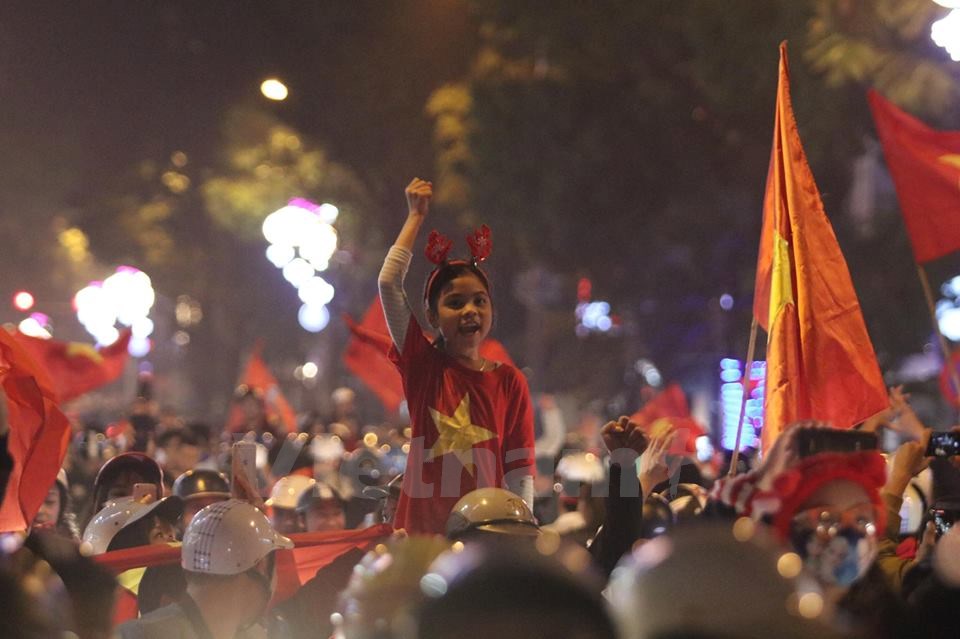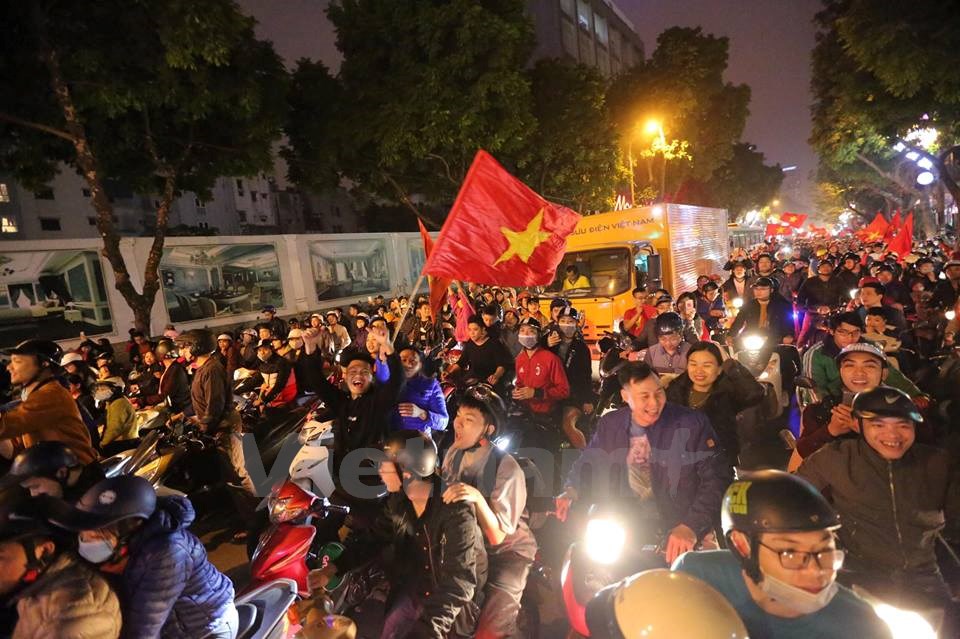 | Người dân đổ ra đường mừng chiến thắng lịch sử của bóng đá Việt Nam. (Ảnh: Minh Sơn/Vietnam+) |