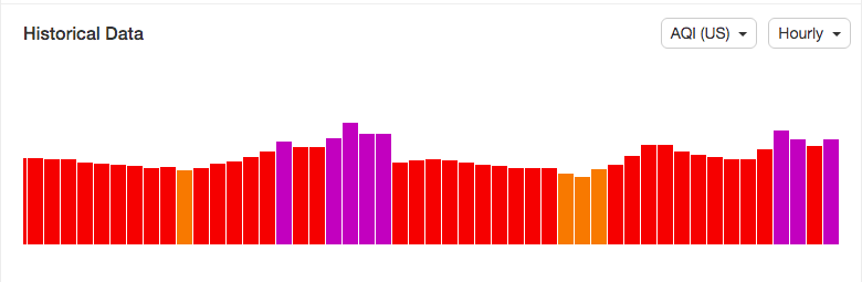 Chỉ số AQI thường xuyên hiển thị màu đỏ ở mức xấu ("unhealthy"), thâ%3ḅm chí màu tím, mức rất xấu (very unhealthy). Hà Nô%3ḅi trong nhiều ngày đứng đầu bảng xếp hạng chất lượng không khí xấu nhất thế giới của tổ chức này. Chẳng hạn, ở thời điểm 8h40 ngày 30/9, chỉ số AQI ở mức 277, chỉ số bụi mịn PM2.5 cao gấp hơn 11 lần quy chuẩn quốc gia (25 µg/m3) và hơn 25 lần trung bình năm của Tổ chức Y tế Thế giới (WHO) (WHO khuyến cáo mức đô%3ḅ bụi PM2.5 an toàn ở mức không quá 10 µg/m3).