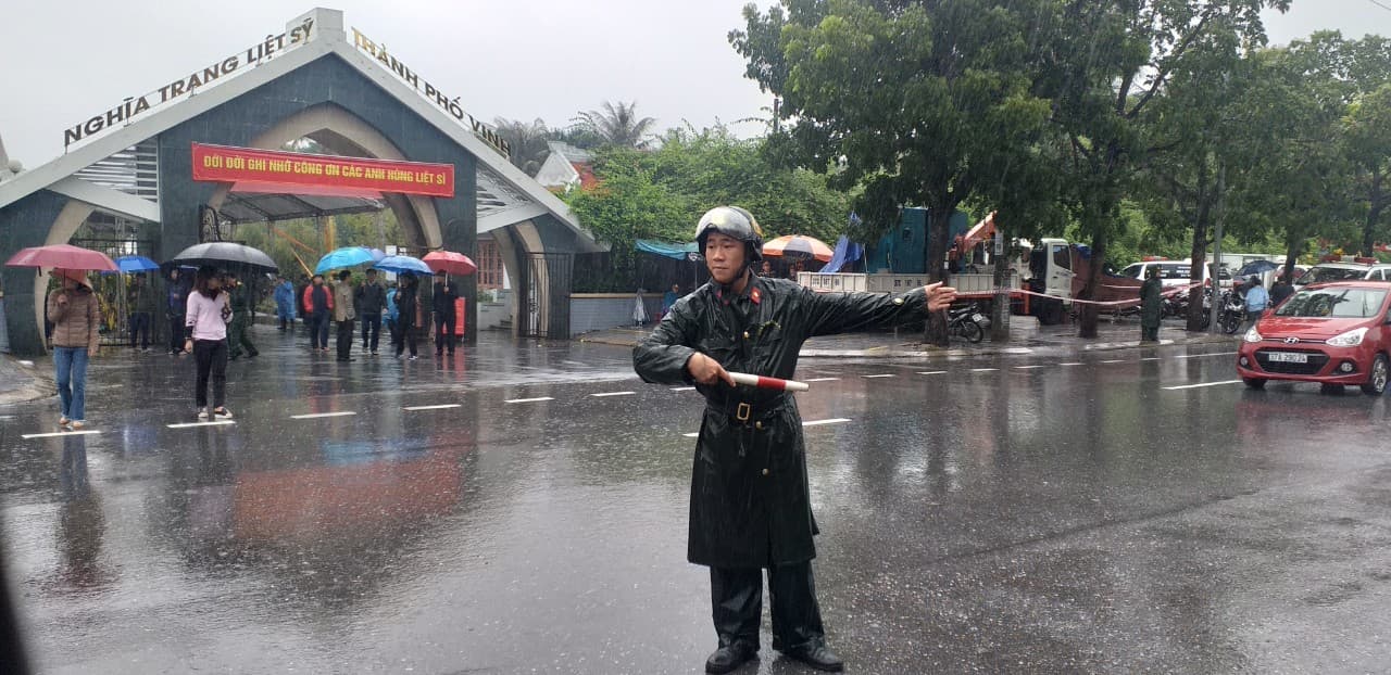 Nhân viên quân sự làm nhiệm vụ dẫn đường và điều tiết giao thông tại Nghĩa trang Liệt sĩ TP Vinh