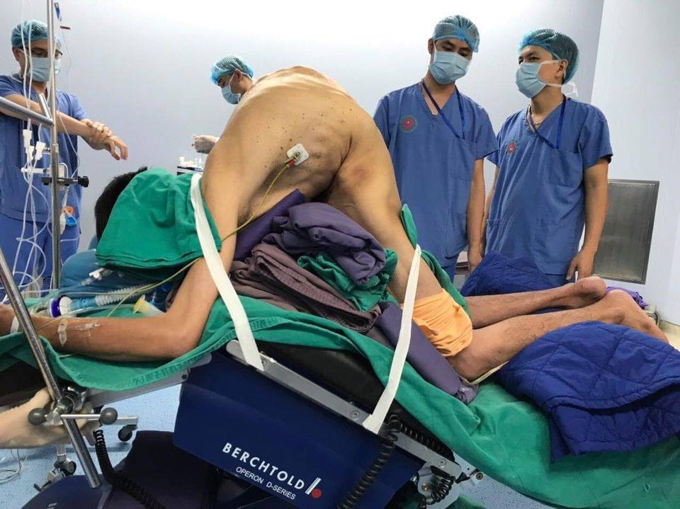 Các bác sĩ đã phẫu thuật chỉnh gù cột sống, cắt chêm xương qua đĩa đệm L3-4 nắn chỉnh gù, ghép xương. Sau mổ, bệnh nhân ổn định, diễn biến tốt.
