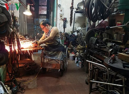 Tiếng cắt, đục, gõ kim loại xe xé, ông Trung vừa nheo mắt tránh ánh sáng chói lóa từ những thanh sắt bị cắt gọt, vừa kể cho khách nghe về “sự tích” của những chiếc xe lăn này.