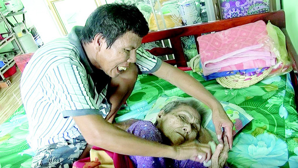 | Ông Đợi đang chăm sóc mẹ |