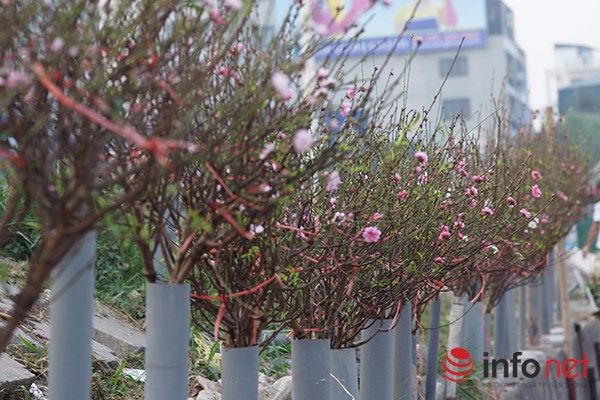 | Những cành hoa đào bắt đầu được bày bán trên đường phố Hà Nội. |