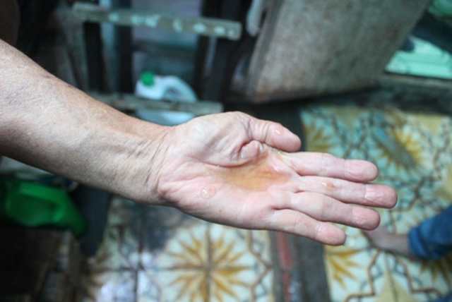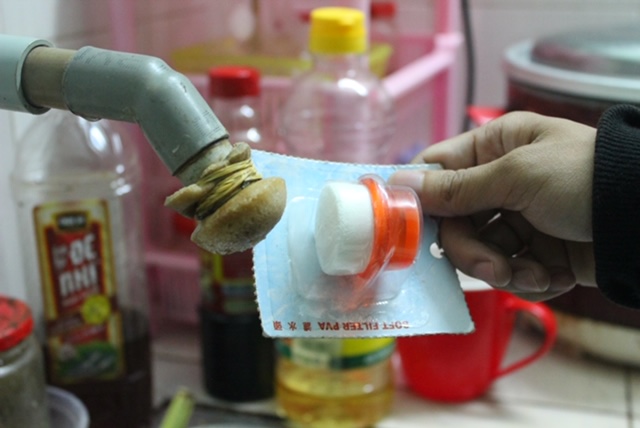 | Người dân dùng vòi lắng cặn để ngăn màu, cứ vài ngày sau lại thay mới |