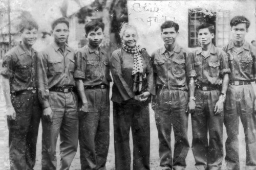 Dũng sỹ Bùi Văn Rê (ngoài cùng bên phải) cùng với Nữ tướng Nguyễn Thị Định và các đại biểu tham dự Đại hội Anh hùng các lực lượng vũ trang miền Nam đầu năm 1974 tại tỉnh Bình Phước.