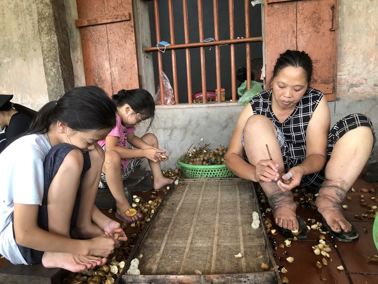 Nguồn thu nhập của 3 mẹ con chị đến từ nghề bóc tâm sen thuê, hàng tháng kiếm được không nổi một triệu đồng. Vào mùa nhãn, chị lại làm long nhãn kiếm thêm nhưng việc thời vụ này, thu nhập cũng bấp bênh.
