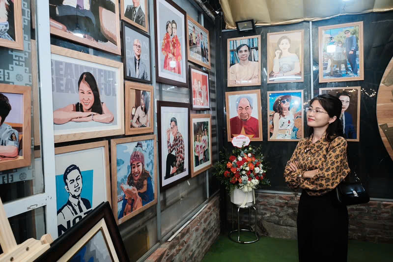 Khách tham quan phòng tranh chân dung tinh xảo, được ghép bằng vải vụn của HTX