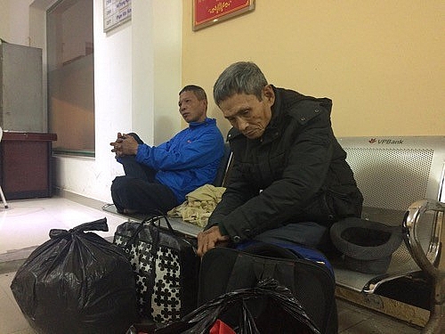 | Ông Khổng Văn Sáng và ông Trần Văn Hùng chờ làm thủ tục tại Công an phường Đồng Xuân trước khi được đưa về Trung tâm Bảo trợ xã hội I đón Tết |