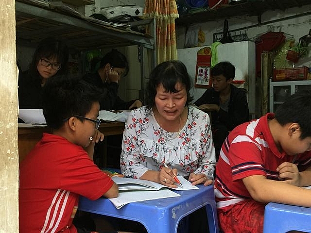 | Chị Phương đang giảng bài cho các học trò trong căn phòng trọ chật hẹp. ẢNH: H.GIANG |