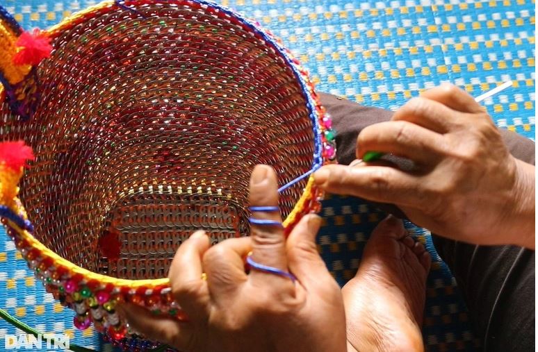Chỉ với vật liệu chính là những chiếc nắp lon nước, qua bàn tay khéo léo, bà đã kết lại rất bền chặt, đính thêm hạt nhựa giả ngọc trai, hạt cườm đủ màu sắc .