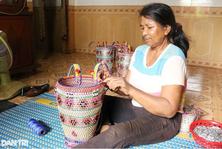 Để có được nhiều chiếc nắp lon nước, bà đã nhờ người cháu đến chỗ thu mua ve chai để xin nhặt. Có được số lượng nắp bia nhiều, bà tiếp tục thiết kế và trang trí cho chiếc gùi của đồng bào Jrai trở nên bắt mắt.