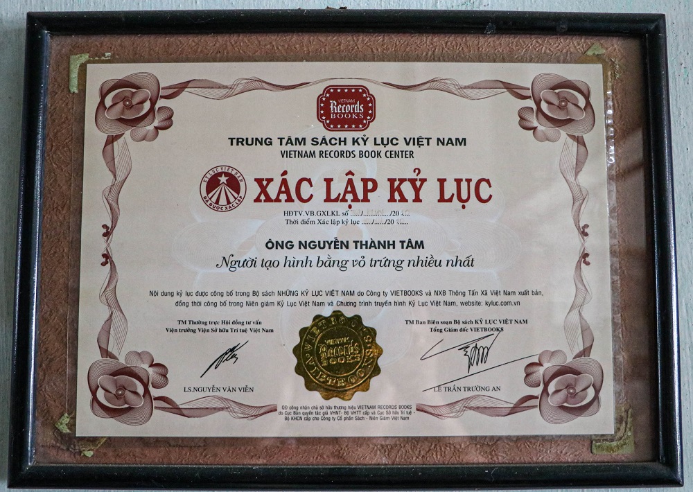 Năm 2010, ông Tâm được sách kỷ lục Việt Nam ghi nhận với khoảng 300 sản phẩm được tào hình từ vỏ trứng.