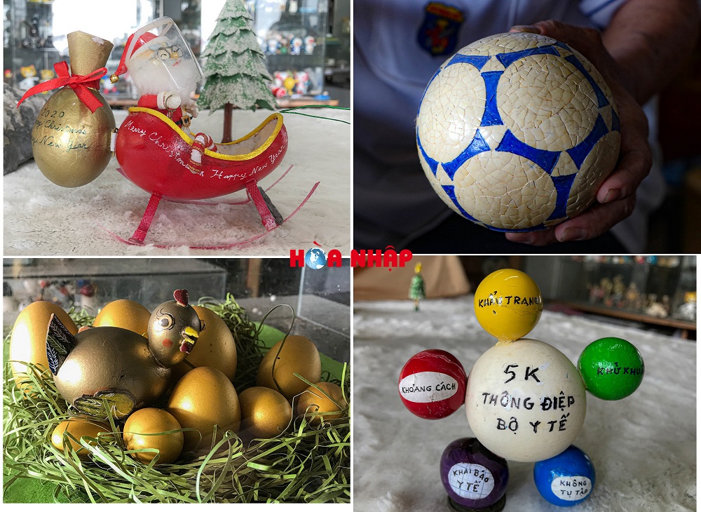 Bước vào căn phòng nhỏ của một chung cư tại quận Gò Vấp (TP.HCM), nhiều người không khỏi bất ngờ với số lượng lớn các hình tượng, nhân vật hoạt hình do ông Tâm chế tác. Từ những vỏ trứng “vô tri, vô giác”, ông Tâm đã “thổi hồn” và tạo ra hơn 1.000 sản phẩm với đủ loại kích thước, màu sắc khác nhau như: linh vật Euro, 12 con giáp, Doraemon, Pikachu, Halloween, ông già Noel…
