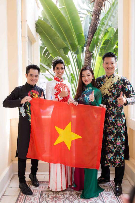 Hoa hậu Hoàn vũ Việt Nam H'Hen Niê cùng Hồ Đức Vĩnh rạng rỡ bên nhà thiết kế Nhật Dũng và Thái Nhiên Phương - Hoa hậu người Việt thế giới 2017.