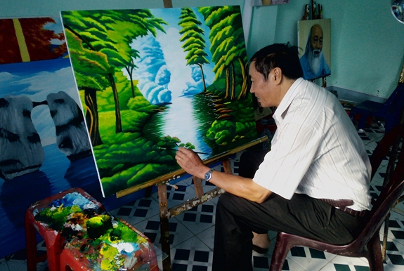 | Thương binh Nguyễn Đình Lực với tay trái luôn miệt mài bên những bức vẽ. |
