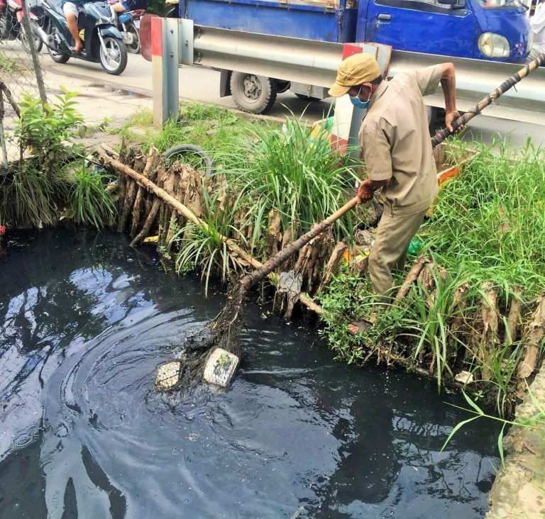 | Mỗi ngày hai lần, ông Nguyễn Ngọc Đức lại đi vớt rác trên kênh Chiến Lược |
