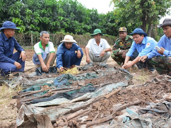 | Ông Huỳnh Trí cùng cán bộ đội K93 tìm hài cốt liệt sỹ quân tình nguyện Việt Nam trên đất bạn Campuchia. (Ảnh: Công Mạo/TTXVN) |